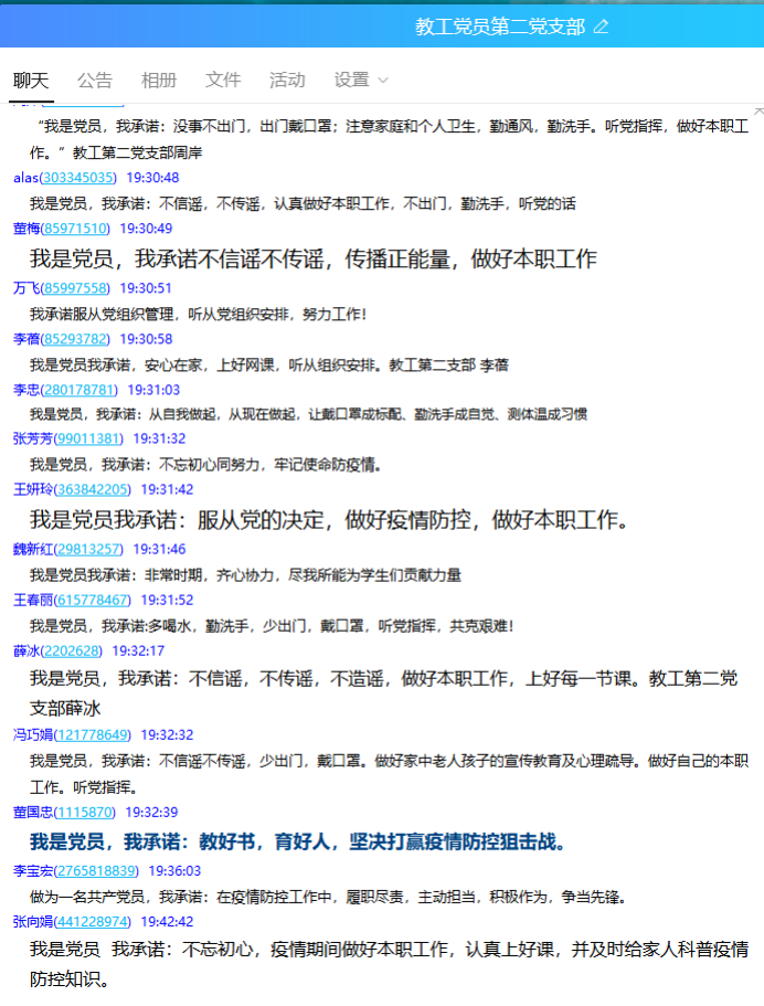 随后,支部党员开展“一句话承诺”,“我是党员,我承诺:不聚会,少出门,勤洗手,从我做起。”“我是党员,我承诺:不信谣,不传谣,不造谣。”“武汉加油!中国加油!”。各位党员铿锵有力地作出自己对防抗疫情工作的个人承诺,饱含深情地表达对武汉和祖国的祝福。时刻提醒自己使命在肩,切实发挥党员先锋模范作用,担当作为、冲锋有我,不造谣、不传谣、不信谣,坚定信心、齐心协力,坚决打赢疫情防控阻击战!学习讨论结束后,支部全体党员同志还在线签署了争当“三个先锋”承诺书,自愿签署“请战书”。