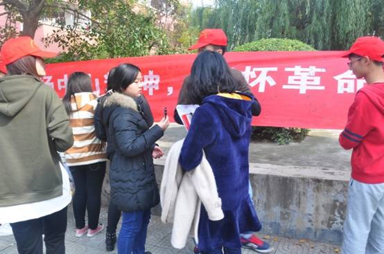 活动当天,负责人员在布芳园餐厅门口拉起了“向孙中山先生致敬”的活动横幅,12:00活动正式开始。活动中志愿者们热情地向路过的同学介绍孙中山先生对新中国乃至整个世界民主主义革命所做出的历史贡献,使同学们再次深入了解和学习孙中山先生的伟大革命精神,并向他们介绍了此次活动的宗旨,大家都积极地在宣传条幅上签下自己的名字,以此来纪念伟大的孙中山先生。经过整个中午的共同努力,活动取得了良好效果,条幅上也布满了同学们的签名。最后,志愿者们合影留念,至此活动圆满结束。