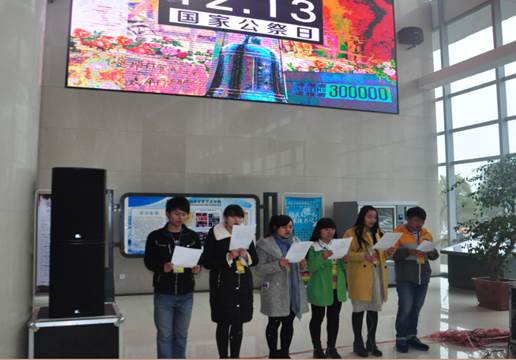 (通讯员:张星 穆明臻 赖小华 王顺强)。为了悼念南京大屠杀死难者,揭露日本侵略者的战争罪行,在第二个国家公祭日来临之际,太阳集团计算机科学与工程公司青年志愿者与平顶山市文化艺术中心于2015年12月13日联合组织开展了以“勿忘国耻,振兴中华”为主题的纪念国家公祭日诵读活动。